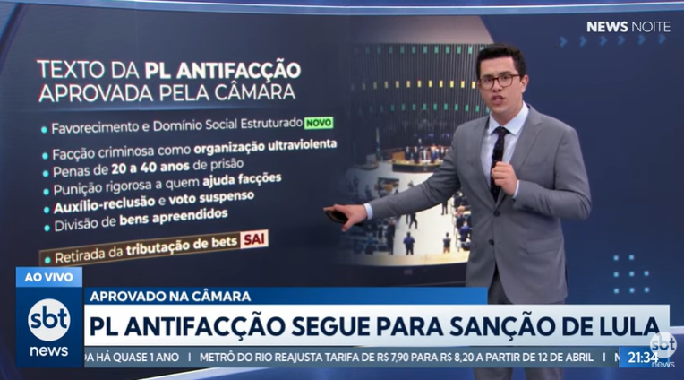 Notícia publicada pelo portal da Câmara dos Deputados, Câmara dos Deputados aprova PL Antifacção Texto aprovado cria a figura da facção criminosa, prevê medidas de sufocamento financeiro e aumenta as penas para os membros dessas organizações, aponta como questões centrais do projeto, que seguiu à sanção presidencial: